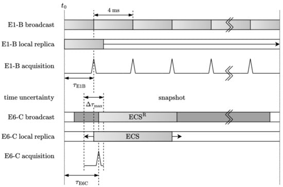Nevertheless, the use of E6 extends beyond refining the authentication process. It could also be used to obtain a sufficiently accurate time reference using the E6 snapshot recorded by the receiver, provided that the required TESLA keys for decrypting the RECS can be accessed through an alternative channel (e.g., a remote server). This approach would permit the avoidance of processing the E1-B signal, enabling the use of simpler, single-frequency receivers for Galileo SAS. The E6-B assisted snapshot mode for SAS is analyzed in Section 3.