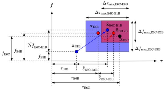 Therefore, in a nominal Galileo CAS operation, the receiver would take advantage of the measurements provided by E1-B—specifically, the code phase delay and the Doppler frequency, denoted and , respectively—to derive the measurement estimates for E6-C, denoted and , respectively. These estimates can be obtained by adding the corresponding offsets between E1-B and E6-C signals: