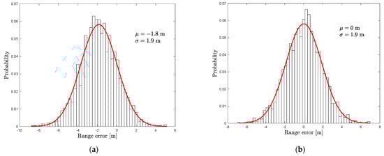 The results are shown in Figure 4, showing the code phase delay differences between E6-C and E1-B (a) and between E6-C and E6-B (b). As expected, the distributions exhibit a Gaussian-like shape, with variance related to the sample’s thermal noise. For E6-C vs. E1-B, the Gaussian is non-centered due to inter-frequency biases, while for E6-C vs. E6-B, there is no bias. A Gaussian curve (in red) is fitted to the experimental data (in blue) to interpolate the mean and standard deviation for each case.