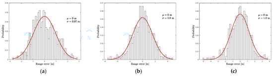 Code phase delay estimates histograms, after removing the trend line, using E6-B snapshots of different lengths and ’s: (a) 25 ms, 45 dBHz; (b) 25 ms, 40 dBHz; (c) 50 ms, 40 dBHz.