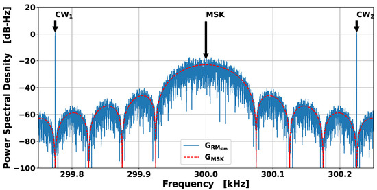 The system shares the medium with a frequency division multiple access (FDMA) scheme in which a bandwidth of 500 Hz in the European area is allocated to each transmitter. Different geographical regions might have slightly different allocation strategies that are not considered in this paper. The transmitted MF R-Mode signal is composed of a minimum shift keying (MSK) component, which contains the D(ifferential)GPS information, and two aiding carriers indicated as and placed, respectively, at Hz and Hz, where is the center frequency of the channel and carrier frequency of the MSK signal. Figure 1 presents the power spectral density (PSD) of a simulated MF R-Mode signal for one channel with a center frequency of 300 kHz (blue line). The different signal components are indicated, and the theoretical PSD of the MSK signal is also presented (red dashed line) to better distinguish them.
