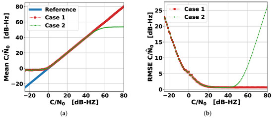 Mean value of the estimated for the two cases compared with the reference line (a) and its RMSE (b) in dB-Hz.