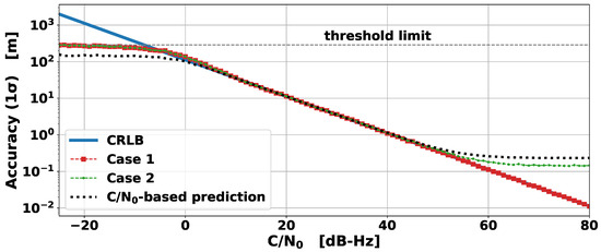 Figure 3 presents the accuracy of the phase estimation in meters obtained in simulation for the two specific cases. In particular, the RMSE of the phase estimation is given for the single tone case (red) and for the R-Mode signal (green). Additionally, the CRLB for the single tone (blue) and the predicted accuracy (black) obtained by using the estimated values of for the case 2 are also presented. Good agreement between the curves is visible for between 7 and 42 dB-Hz. Below 7 dB-Hz, the signal is strongly compromised by the noise. The estimated RMSE approaches the theoretical limit of (represented by the horizontal gray dotted line) with the wavelength of the signal, deriving from the fact that the distribution of the observed phase becomes uniform at . However, for below 7 dB-Hz the signal should not be considered in the positioning algorithm; hence, it is not important to focus on that part of the results, and they are only shown for the sake of completeness.