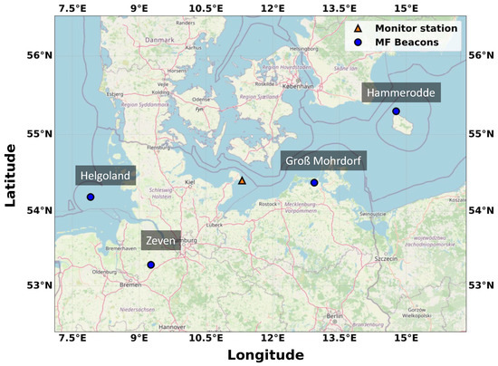 Real data are used to validate the usability of the defined as a measure of the signal quality under optimal propagation conditions, i.e., without biases. In this paper, we use data from a measurement campaign conducted in September 2023 at a static location on Fehmarn island. The map represented in Figure 4 shows the location of the monitor receiver as an orange triangle, and the MF beacons, which were received as blue circles. As is visible in the map, four stations were received, namely, Groß Mohrdorf, Hammerodde, Zeven, and Helgoland, for a total of eight CW signals.