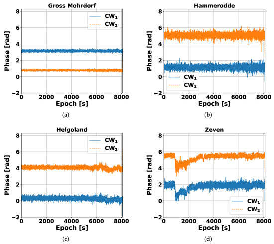 Fractional part of the phase in rad for Groß Morhdorf (a), Hammerodde (b), Helgoland (c), and Zeven (d).