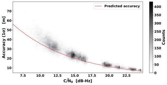 Figure 6 shows the 2D histogram of the phase standard deviation () evaluated over a moving window of 30 samples as a function of the estimated . To reduce the noise of the estimation, a moving averaging filter of 30 samples length is applied. Moreover, the estimate of all the eight CWs is aggregated and used to build the histogram. The data are represented by the gray scale points. Due to the fact that the data were recorded in a static location, the full range of values was not observable, which explains the presence of data gaps in the histogram. The predicted accuracy, estimated with Equation (8), is also visible as a red dashed line. As it appears in the figure, the estimated accuracy becomes noisier when the actual decreases. This is reasonable as the variance of estimated signal amplitude phase variance increases with the increase in the noise [9]. On the other hand, if the true increases or, equivalently, the noise level decreases, its estimate also improves. This agrees with the results obtained in the simulation. In general, it can be observed that the data fit the theoretical curve quite well, which means that the estimated is a valuable measure of the signal quality under optimal propagation conditions and can be used to predict signal ranging performance. Nevertheless, a small bias between the data and the theoretical lower bound is visible, especially for smaller values of . To compensate for this bias and to cover the potential residual error due to AGDF mismatch or transmitter instabilities, an inflation factor could be considered to scale up the actual predicted variance of the measurements. In the future, we plan to extend this study by analyzing longer data sets and try to better characterize the different error sources.