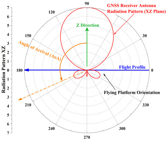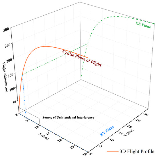 To study a simple case numerically, a DL scenario with y(x) = 0 was simulated by the suggested algorithm. The essential parameters of this scenario, the flight profile and the radiation pattern characteristics, are listed in Table 1 and Table 2, respectively. Figure 3 represents the flight profile of the airborne GNSS receiver. An unintentional Source of interference with an Effective Radiation Power (ERP) of 20 dBW and an isotropic antenna operates at (10, 0, 0.025). The installation/operational height of this transmitter can be selected arbitrarily, but the selected value is nominal for ground-based and mast-installed antennas. The graphical representation of the physical orientation of the radiation pattern of the GNSS antenna in the XZ-plane, the DoA and the AoA, are shown in Figure 3. If the XZ-plane is associated with the antenna’s E-plane, then the H-plane representation would be in the YZ-plane. In our case, as the dynamics of the flying platform requires the onboard GNSS receiver to be able to perform direction-independent navigation, the E- and H-plane radiation patterns were assumed to be identical, but they can be set arbitrarily or by using the measured values of real antennas.