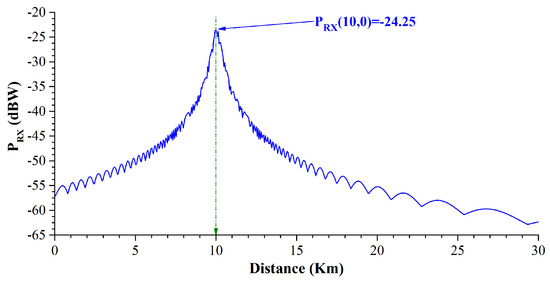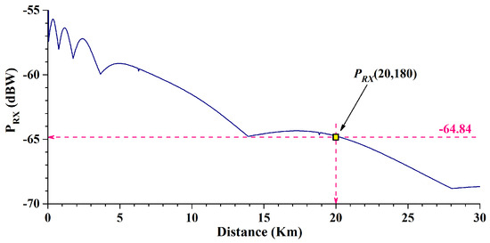 To evaluate the effect of Path Loss on the calculated PRX, consider a single point of measurement Pm = (xi, yi). In addition, the Source is assumed to be located at Pj = (xj, yj, zj). If Pm is rotated along the z-axis, then the relative distance between Pj and Pm varies. An example of such variation is illustrated in Figure 6. The figure is symmetric, which complies with the geometrical configuration. The reflective properties of Earth cause the fluctuations due to changes in the incident angles at various distances.