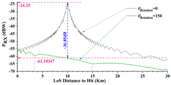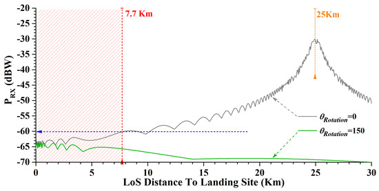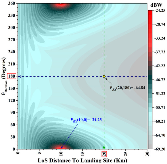 While a SPIDEH may appear to be complicated, the concept is simple: any horizontal line represents the PRX for the desired approach direction, and any vertical line relates to the various possible PRX values at the desired distances. For example, Figure 6 and Figure 7 represent the PRX (x = 20 km, θRotation = [0, 2π]) and PRX (x = [0, 30 km], θRotation = 180°), respectively. The horizontal axis of the SPIDEH graph, the x parameter, represents the line-of-sight distance of the flying platform from the landing site, or LoS-DtLS. The exact location can also be calculated. The SPIDEH graph shows two straight (dashed) lines. The intersection of these two straight lines at (20 km, 180°) are also represented in Figure 6 and Figure 7. The maximum value of PRX in Figure 5, PRX (10), can be represented in the SEPIDEH graph and is associated with PRX (10, 0°). This information implies that the curve of the receiver’s power in Figure 4 is a row of data at θRotation = 0° in a SEPIDEH graph. This type of representation contains enough information to answer the question about selecting an optimal flight pattern. The answer is the path or batch of paths with minimum values of PRX. As the starting point of this flight is somewhere 30 km away from the target, a simple search algorithm can find extremum values by scanning the [0, 2π) span of each mΔx of the SPIDEH graph. Figure 8 represents the results of calculating such an operation efficacy plot, or OEP. For a flying platform operator, it is essential to know the flight routes that have minimum JSR and to avoid those with a high probability of reducing the accuracy of the GNSS receiver. Figure 8 represents these two distinct regions. The minimum and maximum PRX for each x and various θRotation values are shown in blue and red, respectively. As the flying platform approaches the landing site within the blue region, the GNSS has repeated opportunities to update its navigational output. It is important to know that this plot shows the suggested regions, not the flight routes. The flying platform generally cannot follow the dotted path exactly due to limitations in its aerodynamic capabilities (i.e., no sharp turns to the left or right), fuel consumption, or other operational considerations. If the selected flight path is assumed to be set at θRotation = 150°, as shown with a green line in Figure 8, then the resultant PRX with the PRX of the original flight path (at θRotation = 150°) can be compared. This comparison is illustrated in Figure 9. In this case, the total received power for these two approach directions differ by an order of 4. Also, the local minimum values of PRX(θRotation = 150°), the blue radial patterns in Figure 8, are distanced enough to allow the GNSS receiver to update its navigational results.