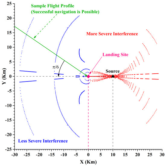 The maximum values of PRX are located around the jammer’s location regardless of whether the flight vehicle passes overhead or beneath the Source. So, if the Source is assumed to be located in the vicinity of the landing site, it can considerably deteriorate the navigational capabilities of the GNSS receiver, as indicated by the PRX graph in Figure 10. On the other hand, it should be noted that the GNSS is a secondary navigational tool in some real-world applications, while the INS is always the primary source of navigational information if it is being used.
