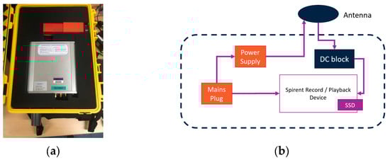 The figure illustrates: (a) the Spirent record/playback device inside the test harness. The grey GNSS antenna can be seen at the bottom left corner. The red plastic section allows airflow through the protective foam, through a high-speed fan (black) attached to the side of the case. (b) Test equipment setup for the data campaign.