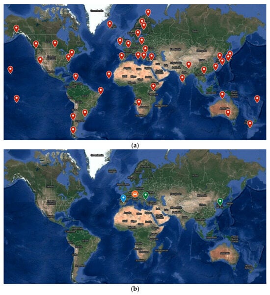 Map showing the stations used in this paper. (a) GMV networks employed in the global ionosphere model are represented with red points. (b) Green icons indicate GPS reference stations used for monitoring. F9P U-blox receiver, utilized in PPPs, is depicted as a blue point. Lastly, the orange car symbolizes the kinematic scenario recorded in Munich.