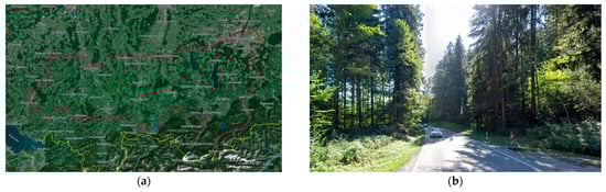 Additionally, kinematic PPP-RTK scenarios covering a total length of 600 km were recorded in Munich and included in the study, as shown in Figure 1. The route is illustrated in Figure 2. While the majority of the environment featured highway conditions, the scenario commenced in sub-urban surroundings. Additionally, the route passed through tree canopy and mountain areas, potentially degrading the solution quality. Figure 2 also provides an example of the environmental conditions encountered in the tree canopy areas.