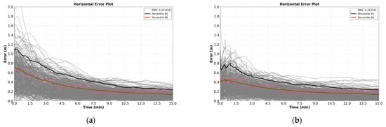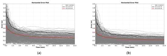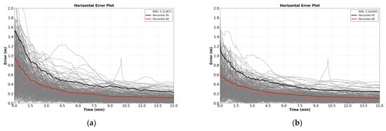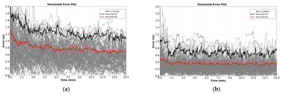 Overlap of PPP-RTK convergences in Madrid utilizing a F9P U-blox receiver. (a) Results without ionospheric corrections; (b) results with global ionosphere model corrections.