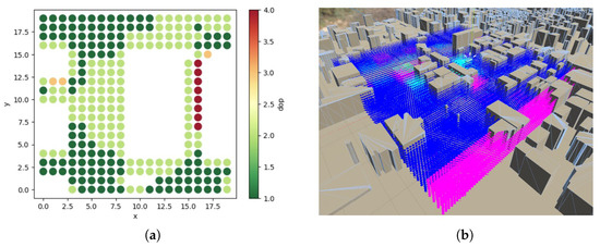 A 2D grid of DoP values for a specific point in time is demonstrated in Figure 2a. The 2D grid represents an area with a region size of 100 m × 100 m at a grid resolution of 5 m, meaning that the DoP data shown in each cell is valid for a 5 m × 5 m × 5 m volume of points. The empty areas that can be seen in the figure represent areas that contain no DoP data, either due to the presence of an obstacle, such as a building, or due to the number of visible satellites being fewer than four (NVAS < 4).