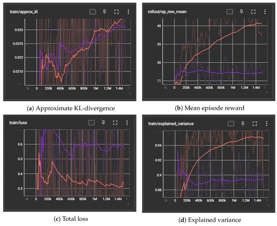 Figure 3 compares the learning outcomes between the fine-tuned configurations in terms of measurements of approximate Kullback–Leibler (KL) divergence, the mean value of episode reward, total loss value and explained variance. From Figure 3a that indicates the update ratio from the old policy to the new policy, the increasing tendency suggests continuous learning behaviours between the two configurations during the training process. However, from Figure 3b, the mean episode reward figure suggests that the first model with short DoP vision finds difficulties in obtaining higher rewards and finding the optimal path since 200k episodes, while the second model presents an increasing capability in enhancing rewards. The priority of the second model versus the first model is also reflected in the total loss values in Figure 3c, providing that the loss of the first model is nearly half of the second model. According to the explained variance Figure 3d, both trained models are capable of predicting environmental rewards at a high rate (over 88%), especially an increment trend in the first model before convergence to 95%.