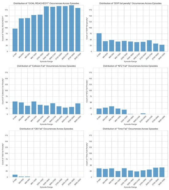 The success rate is defined to assess the episodes that reach the target without triggering termination conditions. The Figure 4 summarizes the occurrence of termination conditions over training episodes to analyze the first model’s performance in situational awareness and path planning. The fundamental finding is that the number of successful episodes reaching the target area increases along with episodes, suggesting significant improvement of the proposed method by 80% in situational awareness and path planning. The DoP quality, NFZ avoidance, and out-of-boundary constraints are being satisfied, providing the decline tendency over episodes. The collision probability remains relatively stable due to challenges in understanding complicated environments and obstruction locations. The condition of time termination is also not targeted for improvement as the time factor is excluded in the current reward formulations to maximize the success rate.