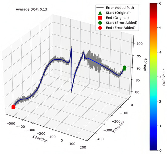 The averaged DoP from the generated trajectory is 0.13, implying the effectiveness of the proposed approach in achieving high GNSS quality during flights. The UAV can automatically adjust the flying altitude and directions in order to search for the optimal path to receive the best quality GNSS.