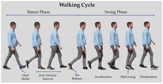 Foot-mounted inertial navigation can achieve high accuracy from poor-quality sensors by performing zero velocity updates (ZVUs) every step []. ZVUs keep sensors calibrated and minimize drift in the position solution. To obtain the best performance, the ZVU algorithm needs to be carefully tuned []. ZVU algorithms are used for pedestrian navigation by collecting inertial data with an IMU and identifying zero velocity intervals [] when the IMU is briefly stationary. Stationary pedestrian detection relies on the walking cycle, where the foot is constantly accelerating or decelerating. The walking cycle is divided into the stance and swing phases []. The stance phase is the period of time when the foot is in contact with the ground, from the heel strike to the heel release []. The swing phase is the duration of the foot leaving the ground until the same foot touches the ground again []. Figure 1 is an example of one cycle of the two phases in the walking cycle. Stationary detection occurs during the stance phase. The stationary period is also known as a zero velocity interval (ZVI), and historically this was assumed to be about 0.2 s within an entire walking cycle of about 1.14 s []. When the accelerometer or gyroscope measurements are below a test quantity, computed from a specified moving window of time, the foot is assumed to be stationary. One accepted threshold value is below the magnitude of 1.239 m/s2 for the MEMs accelerometers, where the value of gravity is factored out of consideration []. The threshold value comes from empirical data and the calculation of acceleration from the average force of the heel strike [].
