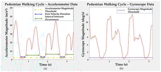 Pedestrian walking cycle demonstration on concrete. (a) Visualization of ZVU parameters for accelerometer magnitude, zero velocity duration and duration between occurrences for accelerometer data. (b) Visualization of ZARU parameter for gyroscope magnitude.