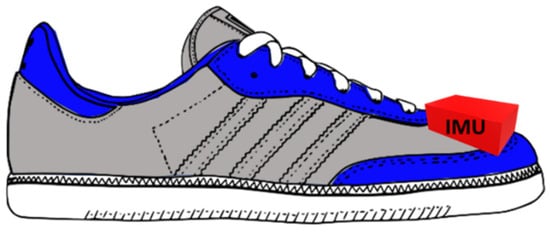 Four terrains were used in previous work and were successfully identified using IMU data: concrete, grass, pebbles and sand []. For algorithm tuning across different terrains, an IMU is attached to the foot of the user for greater sensitivity when recording the inertial data. To reduce the impact on the pedestrian’s gait, an IMU was placed above the toes on top of the right shoe, as shown in Figure 3, thus providing the most consistent step and ZVI detection [,]. Attaching the IMU on the foot in other locations, such as the ankle or the heel requires additional structural support and limits the motion and affecting the natural gait.
