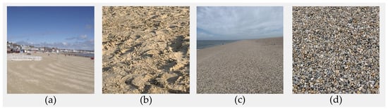 (a) Weymouth Beach in England. (b) Sand at the beach. (c) Chesil Beach in England. (d) Pebbles at Chesil Beach.
