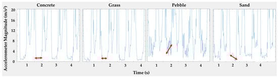 When testing the algorithm, new data were collected across the four terrains. The threshold value used in the literature of 1.239 m/s2 is derived from Schwartz’s work on walking patterns of “normal” males [], as well as Gast’s work on walking speed on different terrains []. OpenShoe assumes the walking surface to be firm, without uneven imperfections. These assumptions are similar to concrete and thus accepted as a suitable comparison for the concrete terrain, as the majority of work in ZVU-aided inertial navigation focuses on indoor navigation. The other terrains considered are not always on a firm foundation, meaning the ground on which the user walks can give way under each footstep. Additionally, the surfaces of the three other terrains may exhibit unevenness or imperfections.
