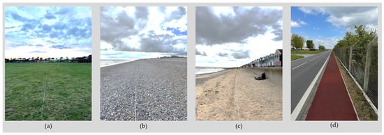 To test the algorithm, datasets were collected at four locations: RAFM– concrete; Red Lodge Community Hall—grass; Aldeburgh Beach—pebbles; and Southwold Beach—sand. Figure 6 is a picture of each terrain at the test locations.