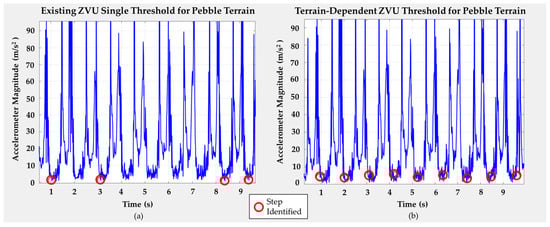 The ZVU algorithm identifies the first instance under the threshold value in the ZVI and waits the time interval before searching for another instance. Occasionally, steps are missed due to time constraints or the magnitude never crossing below the threshold. Figure 7 highlights steps using the ZVU algorithm on pebble terrain. Figure 7a uses single threshold values not tuned to the terrain—missing five steps. Figure 7b uses terrain-specific threshold values and identifies all nine steps.