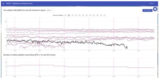Signal quality and number of visible satellites at one station monitored by GNSS-Finland. A satellite with lower received carrier to noise ratio has been highlighted.