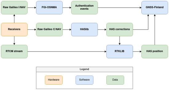 However, due to the novelty of both OSNMA and the HAS, custom software solutions are needed to monitor these services. This will be discussed more in the following subsections. In the future it is likely that more receivers will support these services natively, therefore reducing the need for custom solutions. However, even when OSNMA and the HAS become widely supported by receivers, the currently used software framework has the advantages of flexibility and the ability to perform in-depth investigations, and it is less restrictive in terms of the receiver choice. The high-level architecture and data flow of the new Galileo service components is highlighted in Figure 4.