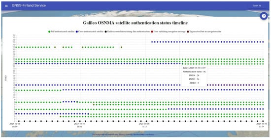 The OSNMA pipeline in GNSS-Finland is implemented as follows. First of all, OSNMA data bits retrieved from the E1 signal are available from the I/NAV navigation pages. The main processing is conducted by the FGI-OSNMA [] software library, which takes these I/NAV pages as an input and handles the authentication logic. Therefore, it is not a requirement for the OSNMA authentication results or even the OSNMA data bits to be directly accessible from the receiver. Instead, only the raw binary-format I/NAV navigation pages are needed. The navigation pages can often be retrieved from the receivers in one way or another, making this approach feasible for almost any receiver. However, different manufacturers have different interfaces to retrieve the I/NAV pages, so some software-side support is still needed for each specific manufacturer. FGI-OSNMA will decode and parse the different OSNMA messages and fields from the I/NAV pages and perform the authentications and react to specific events (such as chain renewal or public key renewal) according to the specification. FGI-OSNMA will generate different authentication events, which will be passed on to GNSS-Finland for storage and visualization. The need for the ability to communicate with different external programs has been taken into account in both FGI-OSNMA and GNSS-Finland. Whenever different authentication events occur, FGI-OSNMA has the capability to execute user-defined callback functions, which in this case will publish the data to the DDS of GNSS-Finland. The different authentication events generated by FGI-OSNMA will be visualized as a timeline in GNSS-Finland, as seen in Figure 5. Specifically, both successful and failed authentications are visible here, as well as some other miscellaneous information related to the authentication process.