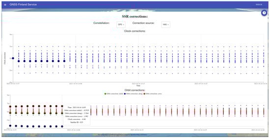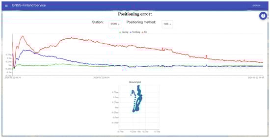 The HAS pipeline implementation is somewhat analogous to the OSNMA pipeline implementation in GNSS-Finland. An RTCM stream for the GNSS observables and a stream of raw Galileo C/NAV messages from which the HAS corrections will be parsed are needed. We used the HASlib [,] software library to decode the HAS corrections and essentially converted the stream of C/NAV pages into an RTCM stream of State Space Representation (SSR) corrections. The HAS SSR corrections themselves can be interesting to monitor, and therefore the corrections are transmitted to GNSS-Finland for storage and visualization, as seen in Figure 6. In addition to this, the RTCM stream with the observables and the RTCM HAS correction stream are used in RTKlib [] to compute the HAS position solution. Again, the HAS position solution will be transmitted to GNSS-Finland for analysis, storage, and visualization.