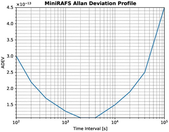MiniRAFS Allan Deviation profile. This curve was obtained on Earth in a laboratory environment, and therefore this technology is not flight-proven yet.