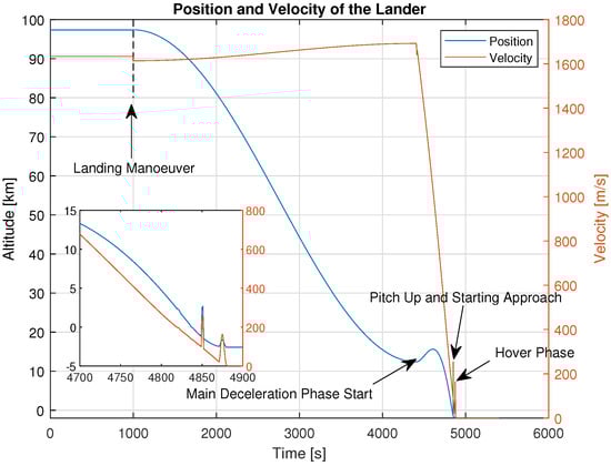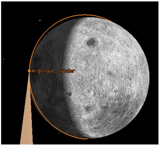 The lander trajectory is based on an internal ESA study for the Argonaut lander []. Figure 3 shows the variation of altitude and velocity of the lander as function of time. This trajectory is visualised in Figure 4. The overall trajectory lasts for approximately 1 h and 30 min. The landing is initialised by a manoeuvre performed at the north pole to start the descent phase and a final touchdown on the South Pole.