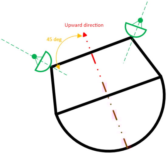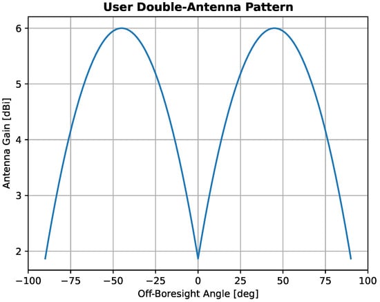 The lander is assumed to be equipped with two antennas on both sides of the lander inclined by 45 degrees, with respect to the upward direction of the lander, to maximise the visibility of the Moonlight navigation signals during the last descent stage. Those antennas are connected to a Moon navigation receiver, which is based on the model of a space-borne GNSS receiver adapted to receive S-band signals and is designed to acquire and track the navigation message (containing, among others, orbit and clock data). The antenna pattern of the receiver assumed is presented in Figure 5 (note that it accounts for two patch antennas mounted in the configuration as shown in Figure 6 along the z-axis of the body frame).