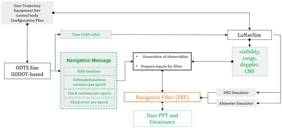 Figure 7 presents the overall software architecture used for this contribution. At first the simulated trajectory of the LCNS constellation and the user trajectory are propagated. For this step, the ESA Godot software [] was used. The propagated LCNS orbits are then used as inputs to the Orbit Determination and Time Synchronisation (ODTS) software (cf. Section 3.2), generating the simulated navigation message, composed of satellites’ position, velocity and clock errors as well as uncertainty, which will be used later in the navigation filter. The lander and LCNS trajectories are then used in ESA’s LuNavSim simulator to generate the simulated measurements (pseudoranges and Doppler) and link information (visibility, C/N0, etc.). The user trajectory is also used within the IMU simulator to produce the IMU measurement time series. These measurements are then passed to the navigation filter that performs the PVT estimation of the lander.