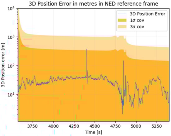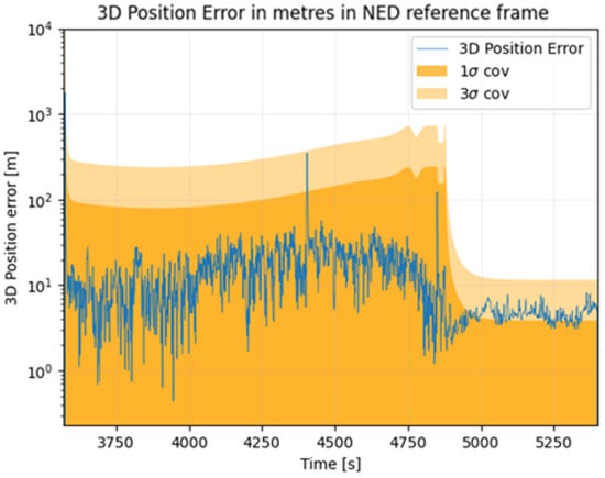 This section will focus on the 3D error as computed in Equation 7, where denotes the position component estimated by the receiver. Both simulations are using the adaptive process noise explained in Section 3.3.1.