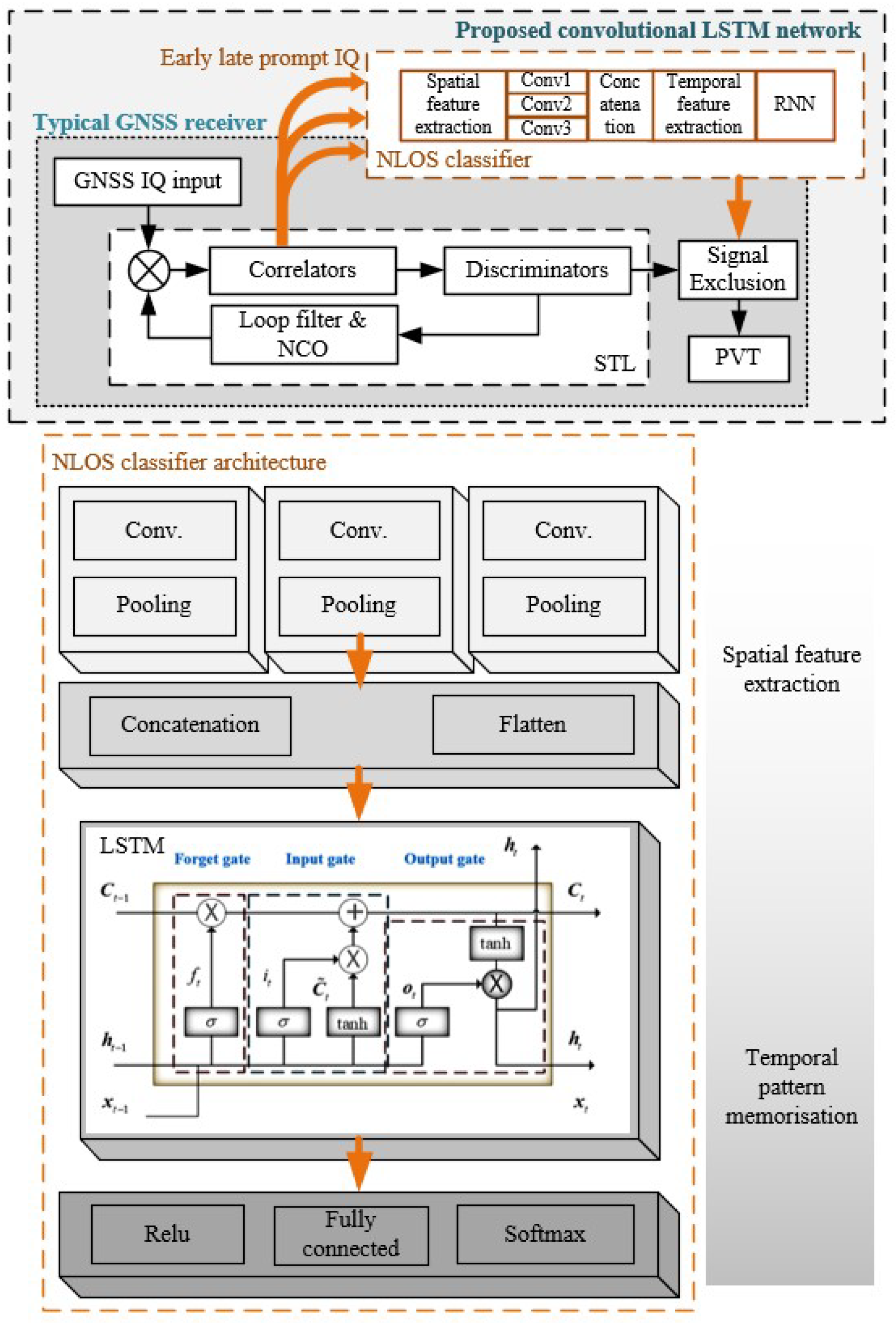 The outline of the NLOS mitigation scheme with the developed convolutional LSTM mechanism placed after correlators is illustrated in