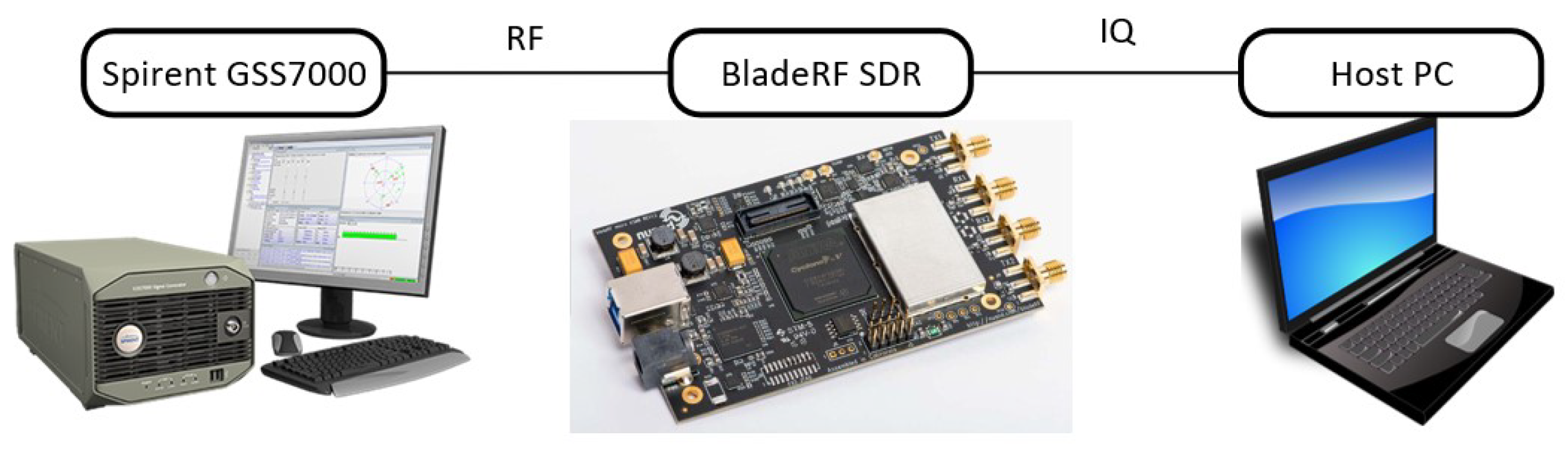 Figure 3, utilizing a Spirent GSS7000 simulator (manufactured by Spirent UK, Sussex, UK) to produce high-fidelity synthetic datasets containing NLOS effects. The RF signals are downconverted to the baseband, and digitized using the BladeRF software-defined radio (SDR) before being saved into binary files on the host PC. The STL implementation with ELP correlators uses FGI-GSRx GNSS receiver software v1.0.0 [