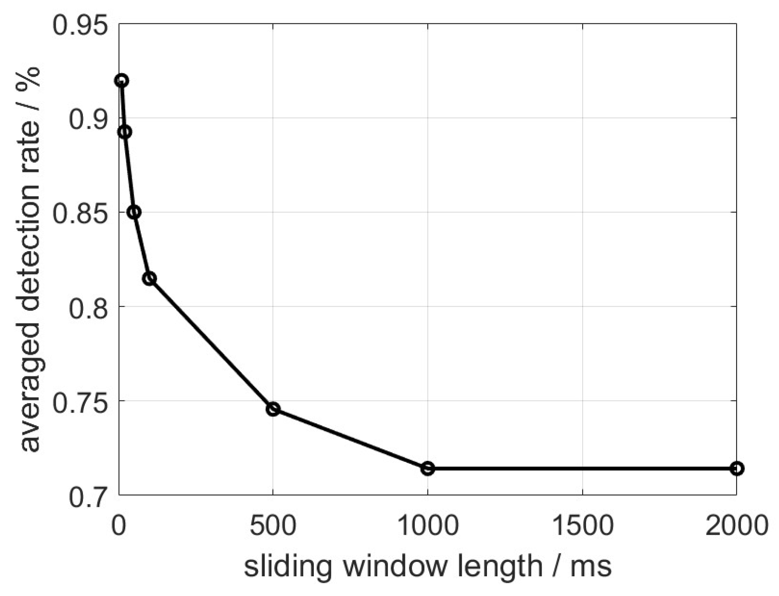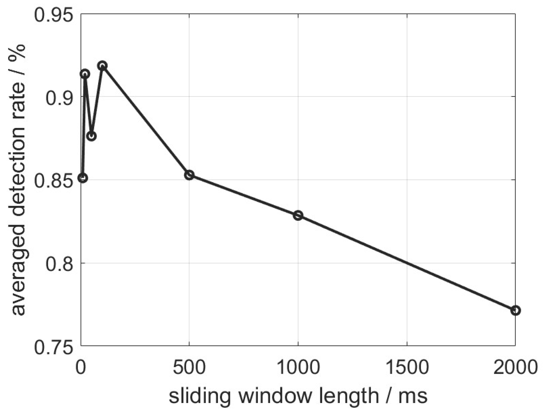 Figure 8, it can be seen that the detection rate starts degrading more rapidly with the increment of the sliding window length than in