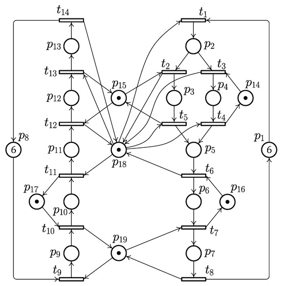 Considering the PN model in Figure 1, there are 19 places and 14 transitions in total, where , and . The initial marking .