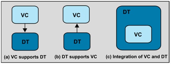 - Integration of VC and DTs: This strategy harnesses the symbiotic relationship between VC and DTs to maximize the benefits of each technology. It ensures real-time synchronization with operational data, increasing their effectiveness from the initial design phases. One of the main approaches is to make VC a subcomponent of DTs, whose scope of application is vast and extends across the entire product and plant life cycles [20].