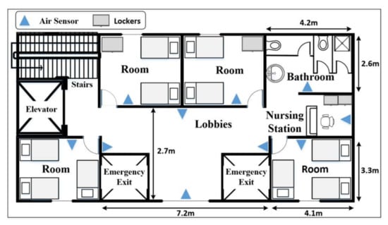 At the site of the experiment (Figure 1), sensors and robots were deployed to ensure the complete collection of air values within the organization. The sensors analyzed the number of sensors required for deployment within the organization. Air sensors and smart robots are used in hospitals to maintain the health conditions of residents and the quality of the facilities. When a device’s data are sent through a gateway, a vertical connection to the information platform is established so that the organization’s caregivers can manage the environment in a unified way. This approach is consistent with the basic concepts of protecting residents, caregivers, and the environment.