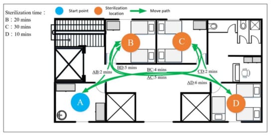 - Fitness Calculation: This study aims to achieve the maximum sterilization effect in the shortest time. In addition to the scenarios mentioned, there are special events and temporary tasks. If sterilization is performed at the same time or too close to the actions of a scenario, it results in a waste of time and little benefit. To address this problem, we consider the overall time and intervals between sterilization in each room to improve the effectiveness of air cleaning. When the overall time and interval of the sterilization operation are taken into account, the overall efficiency of air purification is improved. When sterilization operations are performed at the optimal time and the most appropriate location, the effectiveness of sterilization is maximized to obtain the best results.The total time required to reach each room is used as a parameter in the evaluation. Although the actual situation may be complex, one departure point and three rooms are included in this study, as shown in Figure 4. The exit point is represented by A. It is observed that when there are fewer and simpler parameters, all possible permutations can be exhaustively considered and the total time cost can be calculated. The green routes in Figure 5 offer the greatest savings in time. After calculating the sterilization time at each site, the total time is as follows: 2 + 20 + 4 + 30 + 2 + 10 + 6 is 74. Under the above conditions, the optimal path for the specified time is 74 for A > B > C > D > A.