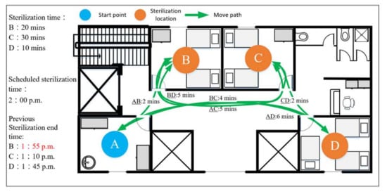 Figure 5. Simulation of the sterilization path: special case.In a special case, we show a scenario in which the scheduled sterilization is currently at 2:00 p.m. and is about to begin (Figure 5). However, due to an anomalous value observed in room B, the sterilization process is finished at 1:55 p.m. When adapting the path parameters, it becomes clear that recommending room B shows a time interval that is not sufficient. In addition to considering the path parameters, we introduce a time interval penalty parameter. At each room, the interval between the time of arrival and completion of the previous sterilization are calculated. This interval is deducted after the complete process is calculated. This ensures enough time between sterilization, preventing a situation where we have just decontaminated and are straightaway heading to the next execution. - Selection: Once the fitness functions of all the combinations are obtained, they are ranked. When calculating the fitness function, it is possible to identify combinations with smaller fitness values as representing better results. These combinations require less time and longer intervals. In simpler cases, the optimal combination is found by sorting. However, in most cases, the scenarios are complex, so it is necessary to find more precise combinations of paths by means of mating and mutation. This iterative approach allows for the gradual improvement of the initial result until the optimal solution is reached. The use of mating and mutation in optimization problems is justified by the ability to refine the initial result until the optimal solution is identified. By employing these techniques, the precise combinations of paths can be identified to minimize the time spent and the time intervals.