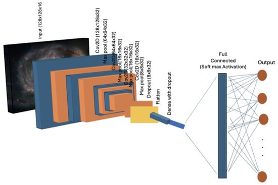 The input layer handles 128 × 128, 3-channel color images, initially resized from 256 × 256 images in the Galaxy10 DE Cals dataset. The first convolutional layer employs 16 filters, generating 16 feature maps (128 × 128). Node count increases in hidden layers to enable intricate feature detection. Each convolutional layer is followed by max pooling to downsample inputs while retaining critical features. A 2 × 2 kernel and a stride of 1 pixel in max pooling mitigate noise interference.