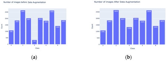 Class distribution of the images before (a) and after (b) class imbalance mitigation.