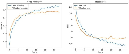 As shown in Table 1, the custom model showed an overall accuracy of 67% on 1874 samples distributed across 10 classes. Class 2 showed 83% precision and 84% recall, resulting in an 83% F1 score, while Class 3 presented with a 79% F1 score from 73% precision and 86% recall. In contrast, Class 0 underperformed with only a precision of 36% and a recall of 19%, yielding an F1-score of 25%. Classes 1, 5, 6, and 8 demonstrated moderate effectiveness with F1 scores between 54 and 74%. Figure 6 shows the loss/accuracy curve of the tailored ResNet50 model. The training and validation accuracy curves are closely aligned, with training slightly higher, suggesting minimal overfitting.