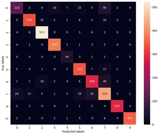 As shown in Table 3, the EfficientNetB5 model demonstrated strong performance with an 87% accuracy on a dataset of 3548 samples across 10 classes, split into 80% for training and 20% for testing. High precision and recall for Class 2 and 3 were as follows: F1-scores of 94%, a precision of 92%, and a recall of 96%. Class 4, despite having the fewest samples showed an F1 score of 77%. Class 7 presented the lowest F1 score at 78%, indicating variation in class performance. This showcases EfficientNetB5’s effectiveness in managing multiclass classification with balanced results across various classes.